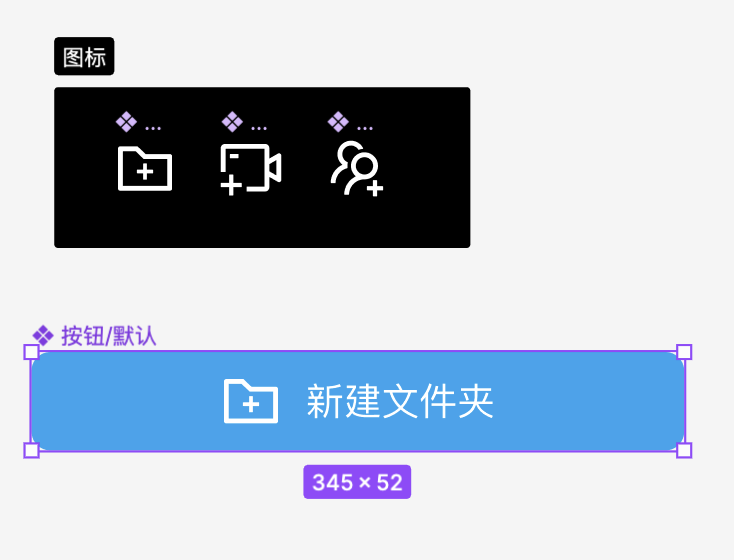准备好3个图标分别制作成组件,再绘制一画框添加文字和图标组件一起制作成一个按钮组件。制作组件只需点击顶部菜单的按钮即可。