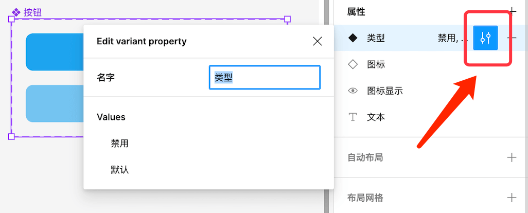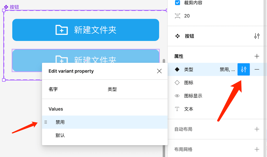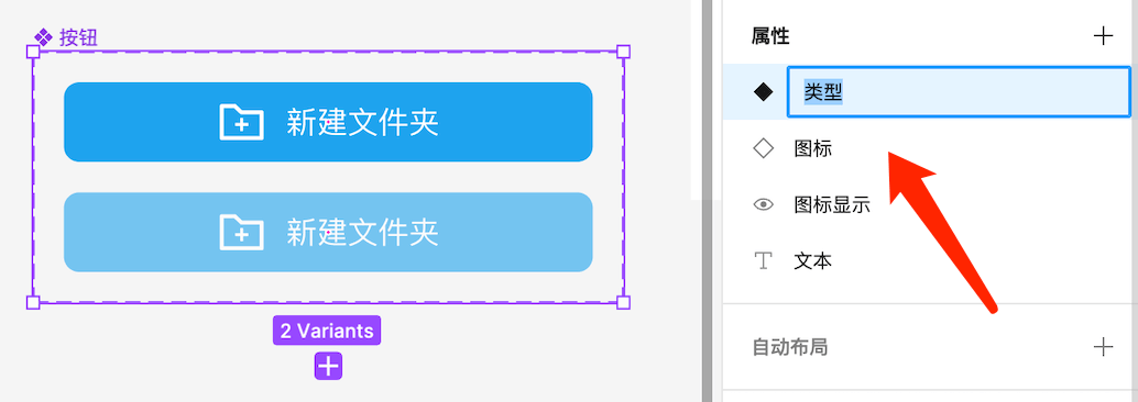 在这个案例中我们给按钮添加一个禁用状态的变体,点击顶部工具栏的添加变体按钮