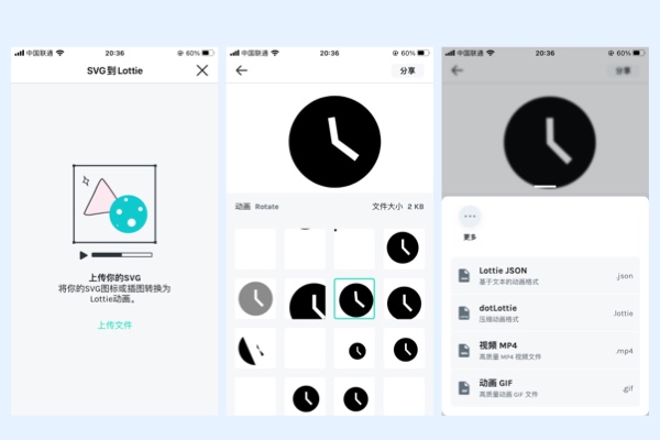 用户可以上传SVG文件,然后选择预设动画,制作新的Lottie或影片文件。