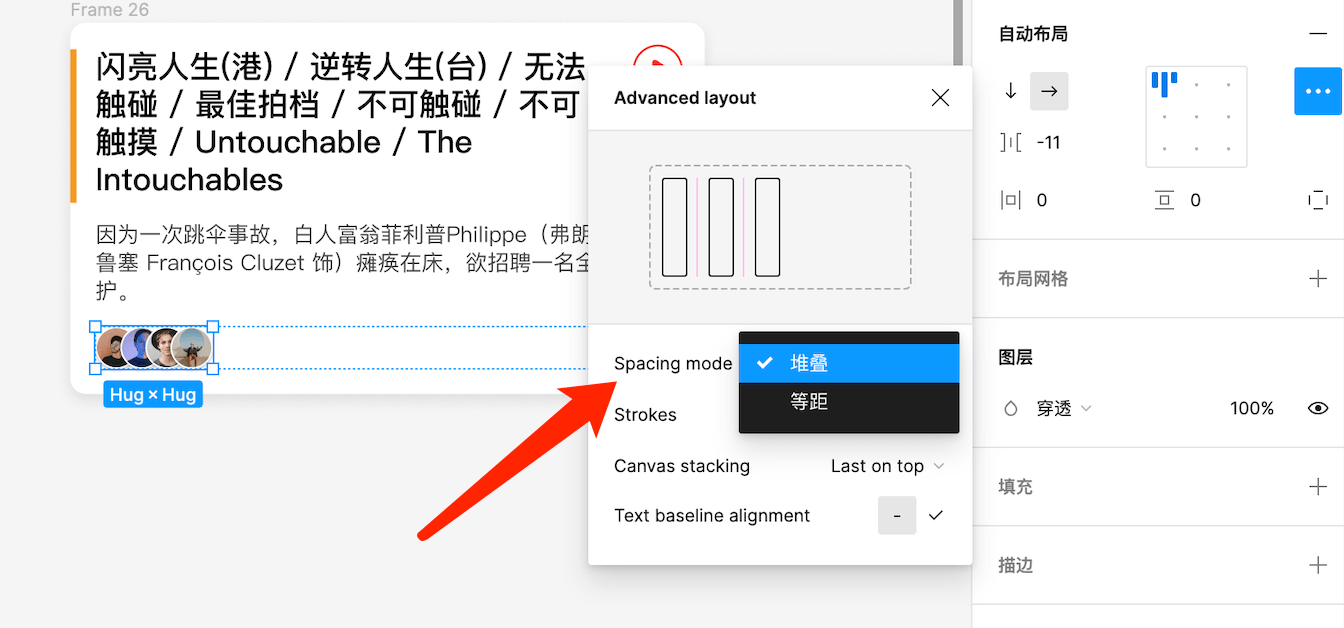 选中四个头像素材,添加自动布局,快捷键shift+A,将间距类型修改为堆叠。