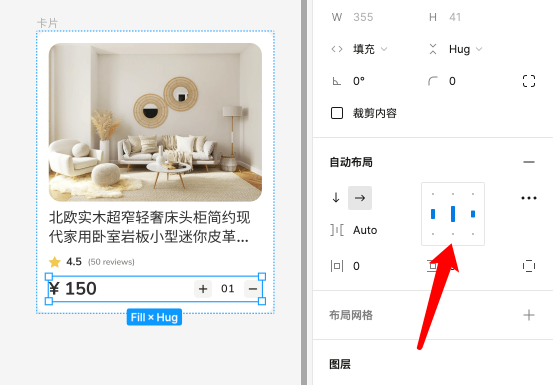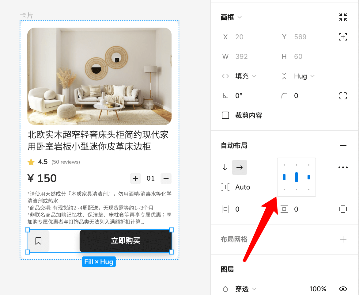 5.接着我们添加价格和购买按钮。先将价格和购买按钮两个添加水平自动布局,然后拖入父级容器。设置为水平方向的填充容器,并添加一下等距分布。这样按钮和价格就会分别分布在左右两侧了。