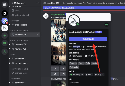 在 Discord 中,找到一个已经拥有 Midjourney 机器人的频道。如果你没有这样的频道,可以先加入 Midjourney 官方服务器就会看到Midjourney 机器人了。