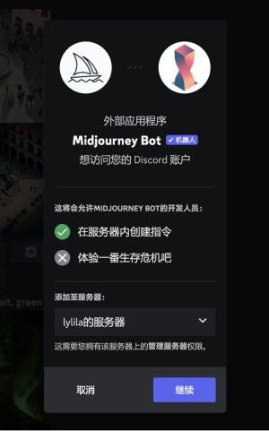 在频道中,找到 Midjourney 机器人的昵称,并右键单击它。在弹出的菜单中,选择“添加至服务器”选项。然后,将被重定向到 Midjourney 官方网站,要求授权机器人访问您的服务器。只要选择你创建的服务器并点击“授权”按钮就可以了。