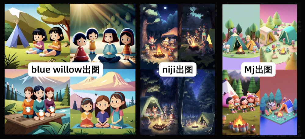 我们使用同样的prompt分别用Niji和Blue Willow机器人生成图像,可以看出目前Blue Willow的出图水平还处于呆木的阶段,很多提示词也没办法准确识别。